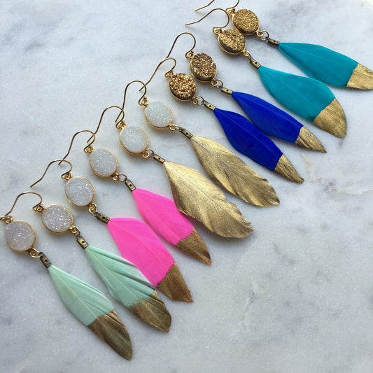 Gold Dipped Feather Earrings, Gold Druzy Earrings, White Druzy Earrings, Feather Earrings, Statement Gold Dipped Feathers, Unique Gifts
