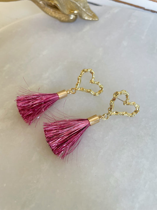 Gold Heart Earrings, Valentines Day, Tinsel Tassel Earrings