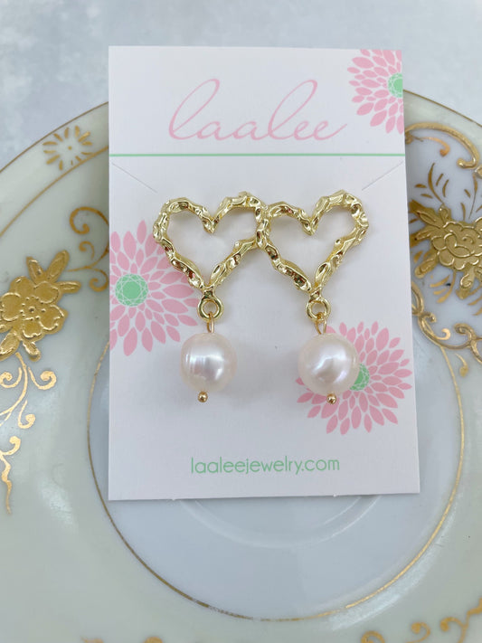 Gold Heart Pearl Drop Earrings