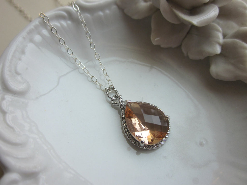 Blush Champagne Necklace Peach Pink Silver Teardrop - Sterling Silver Chain - Bridesmaid Necklace - Bridesmaid Jewelry - Valentines Day Gift