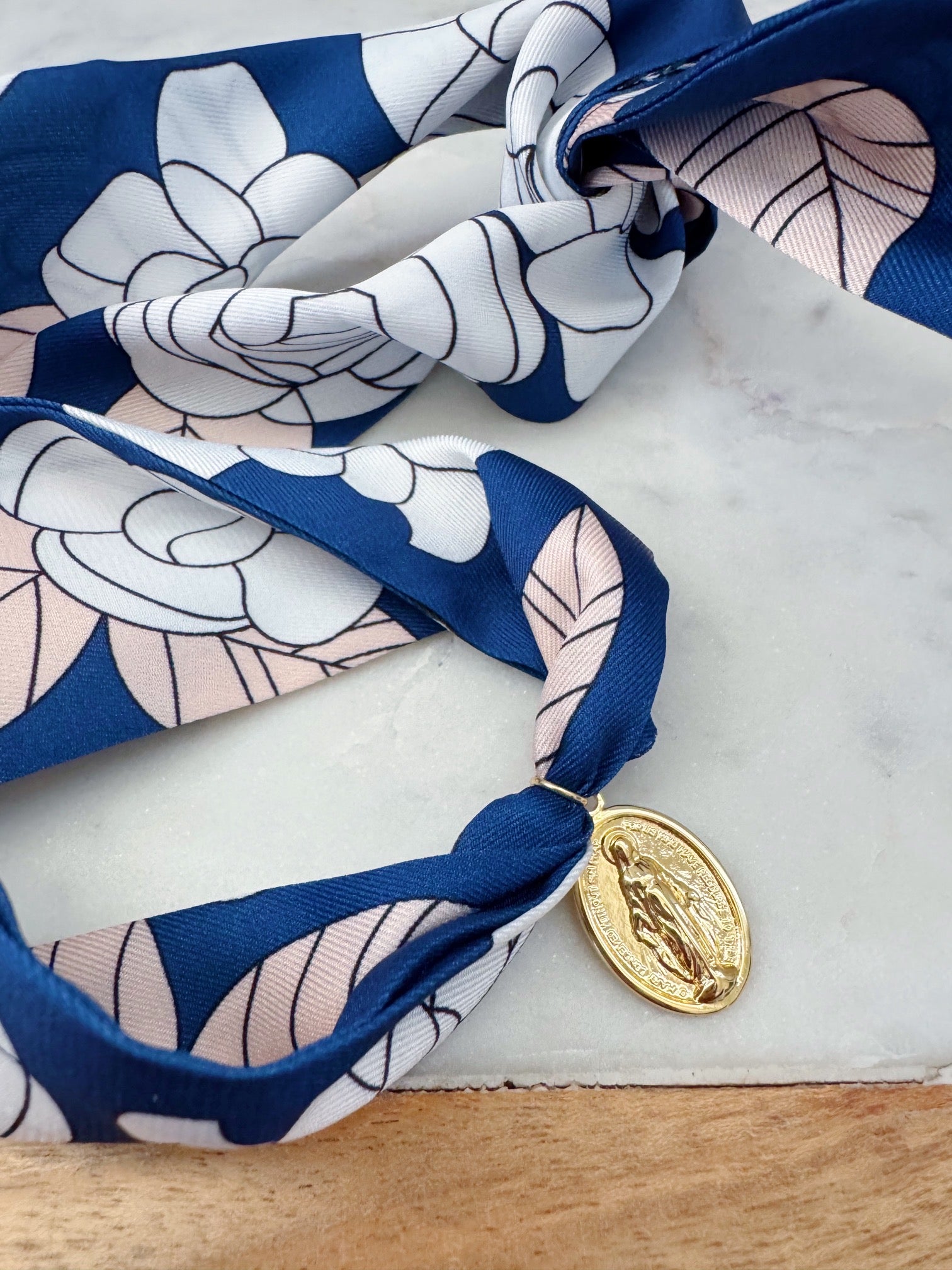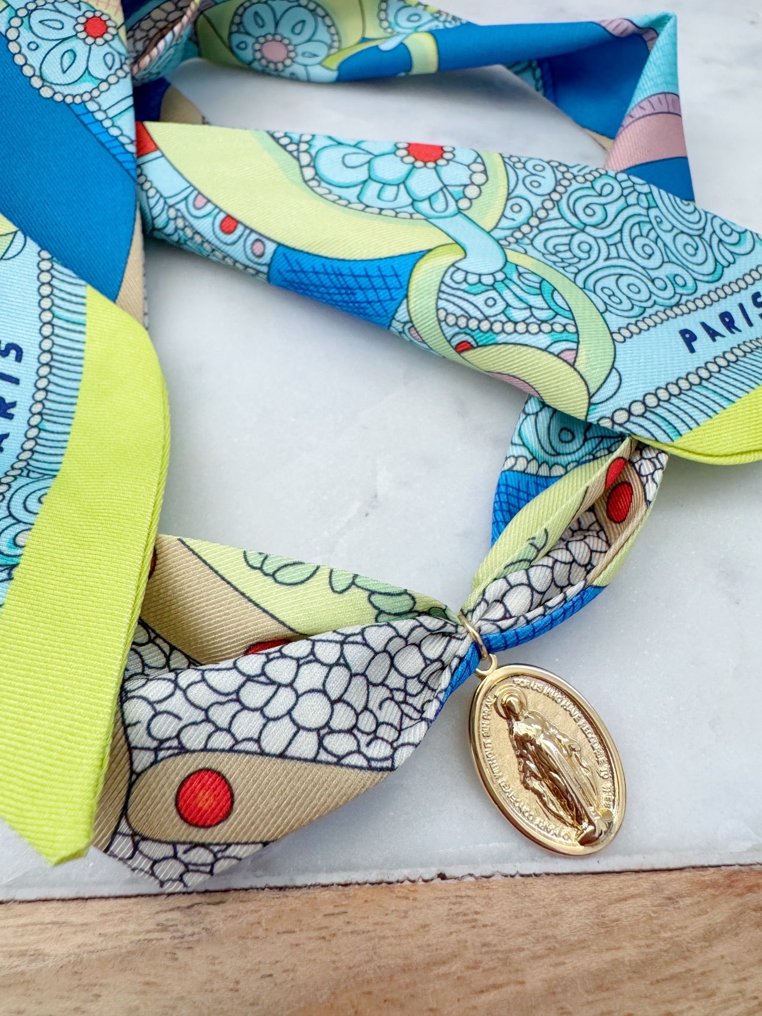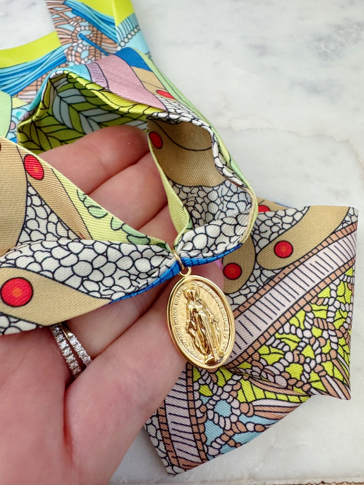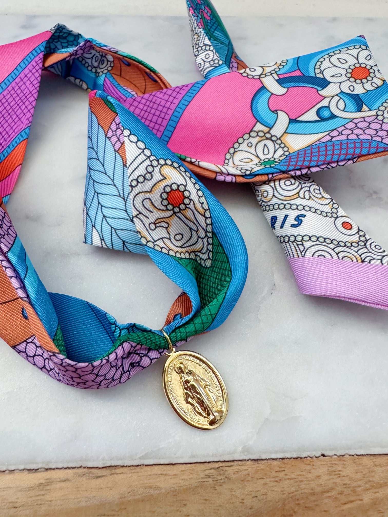 Gorgeous colorful scarf necklace with a 14k gold plated Miraculous Mary pendant.