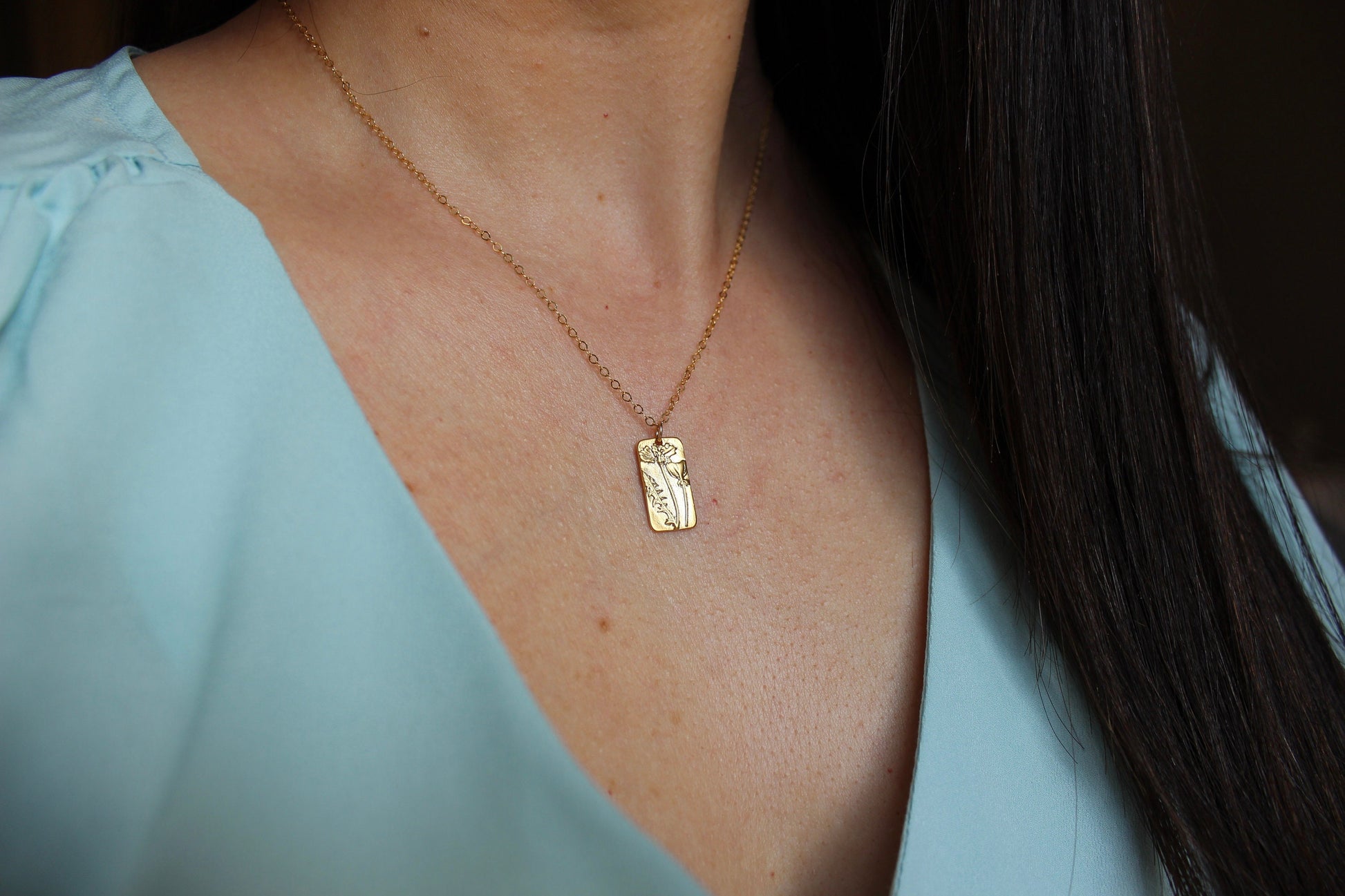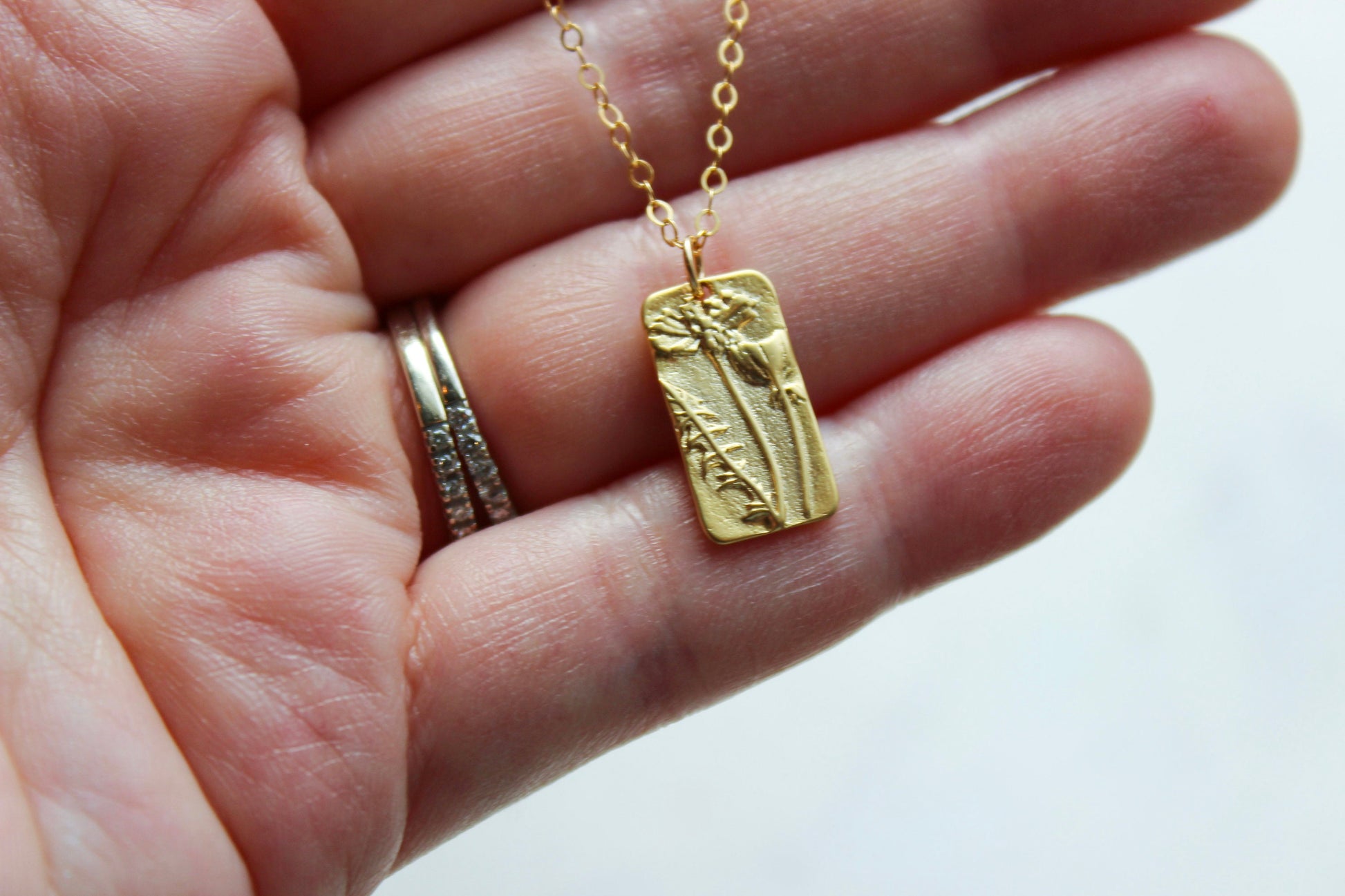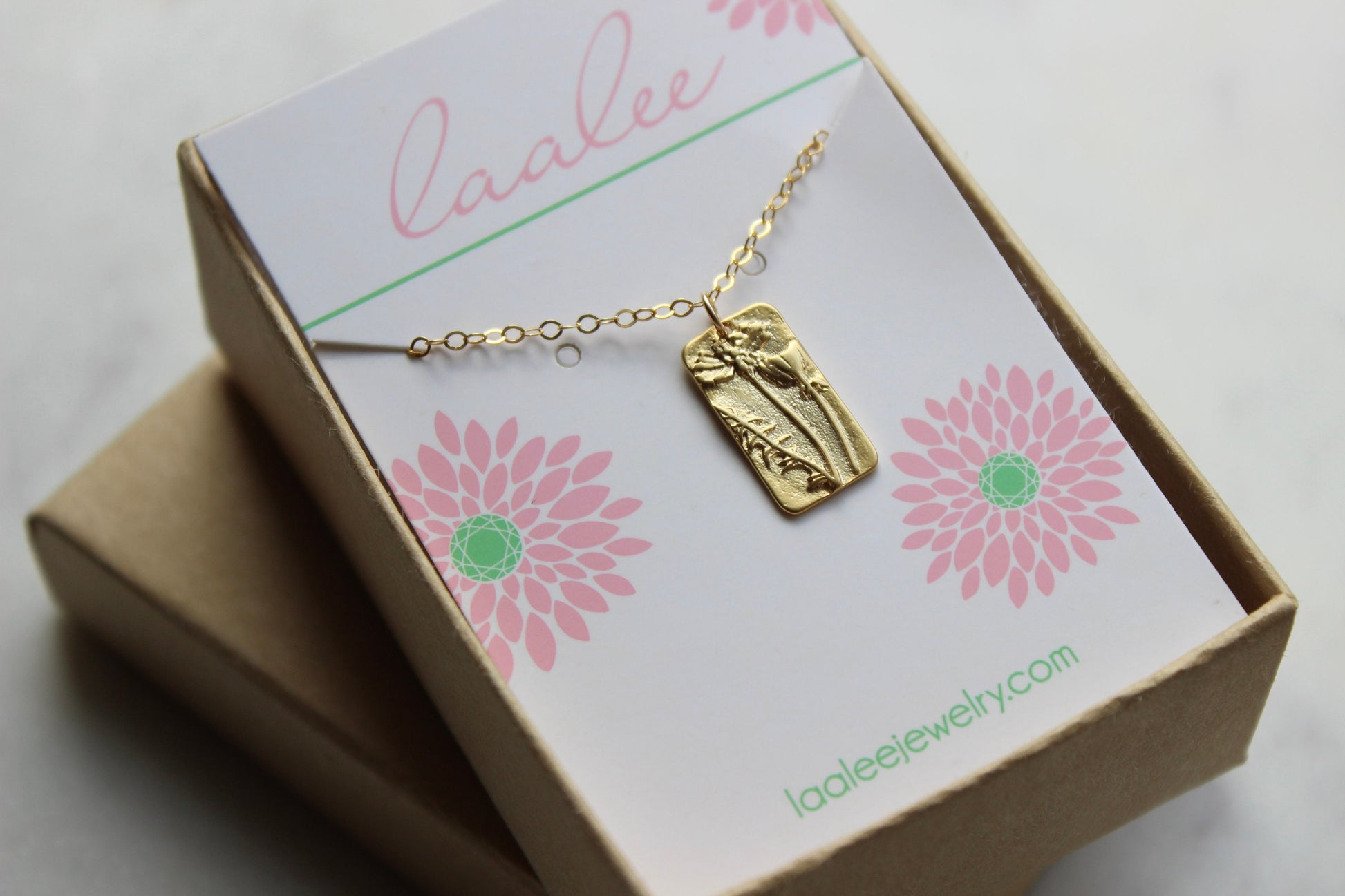 Whimsical flower rectangular pendant measuring 9x17mm and is 14k gold plated. The chain, jumprings and clasp are 14k gold filled. Giftbox included.