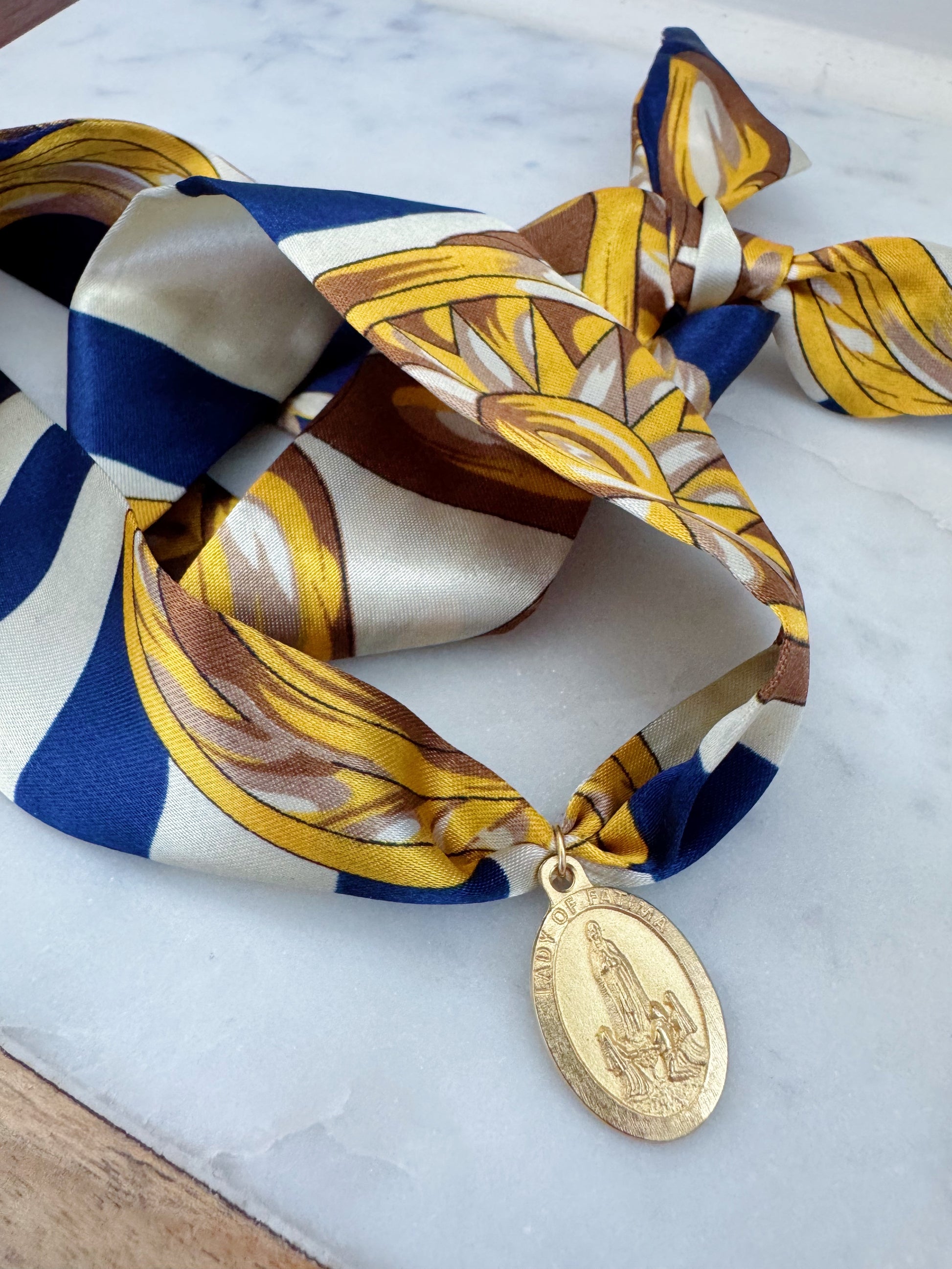 Gorgeous 14k gold plated Our Lady of Fatima pendant on a scarf necklace! You can adjust the scarf necklace to your liking and add knots where you'd like as well! Perfect gift for all who adore Our Lady of Fatima!
