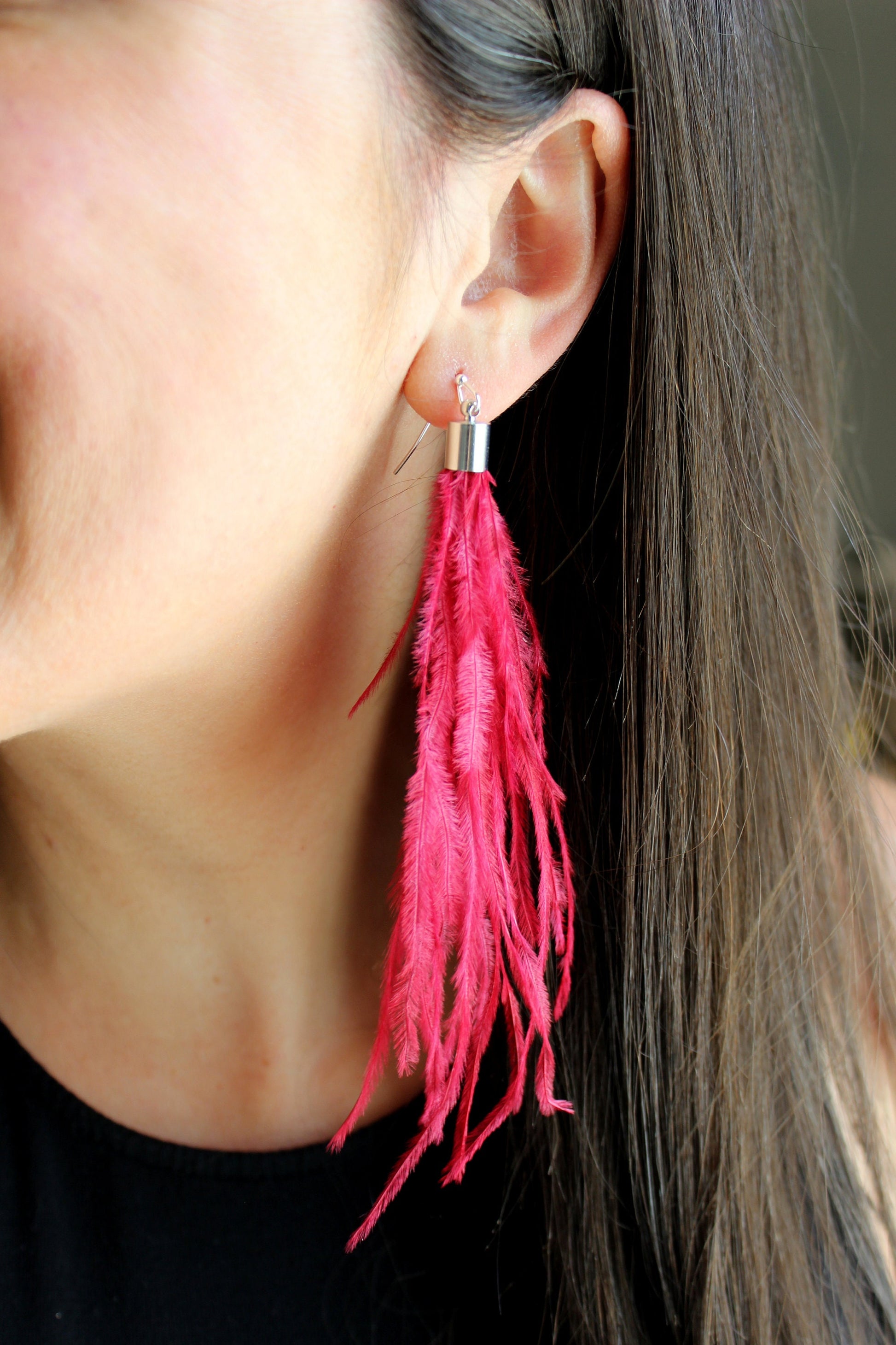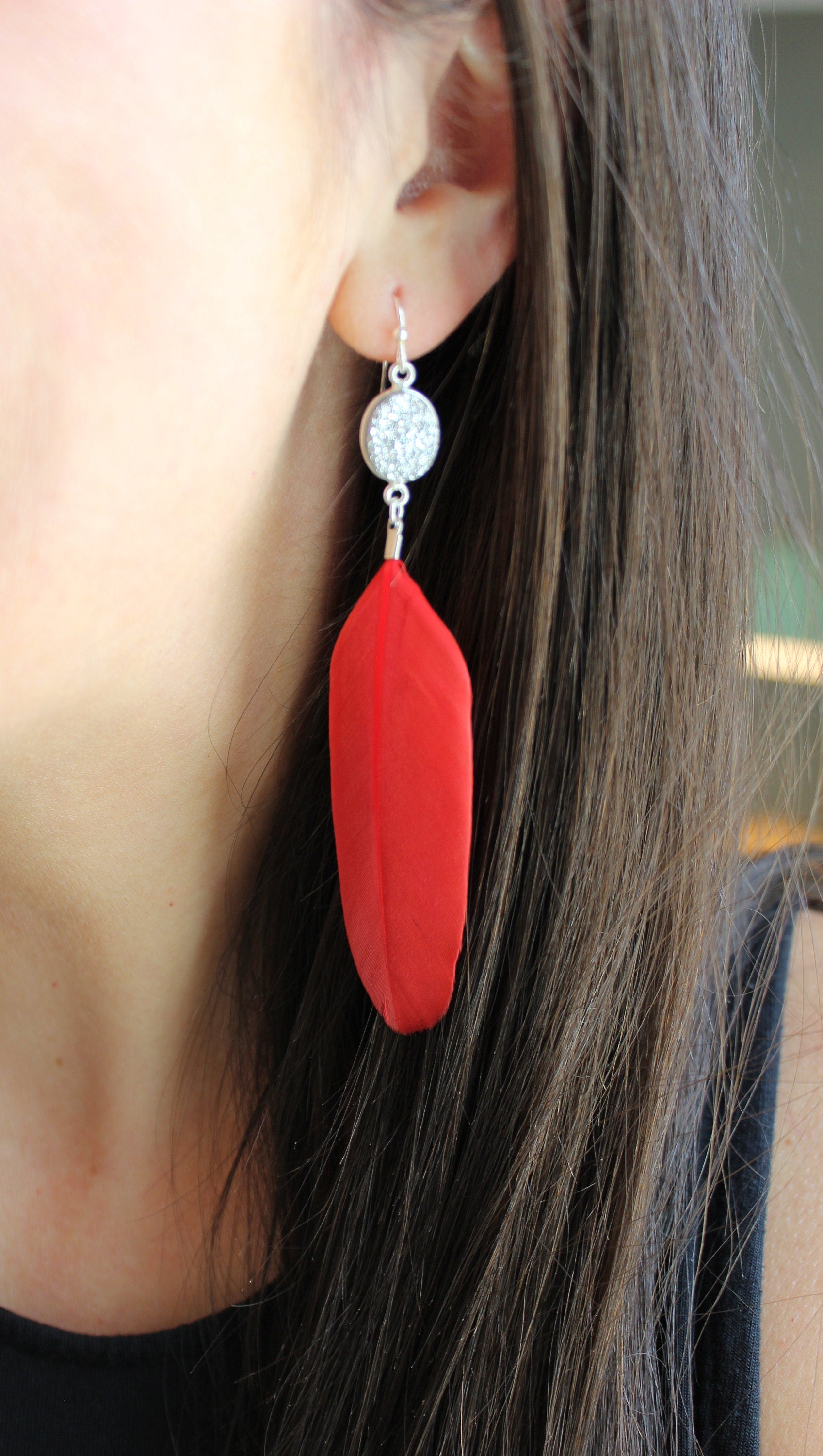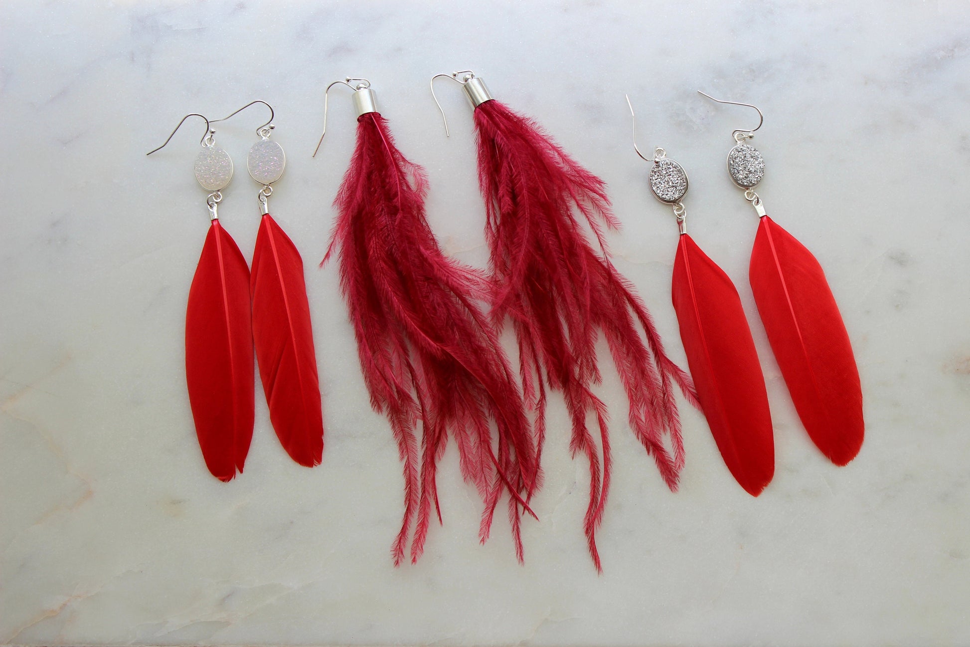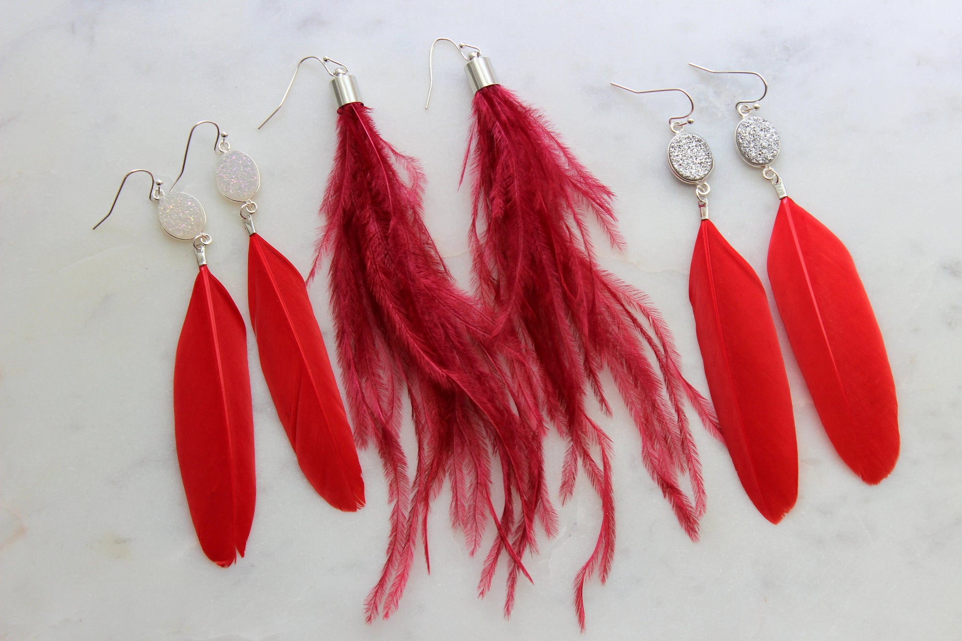 Red Earrings Statement, White Druzy Earrings, Red Feather Earrings, Silver Earrings, Feather Jewelry, Gameday Jewelry, Long Feather Earrings
